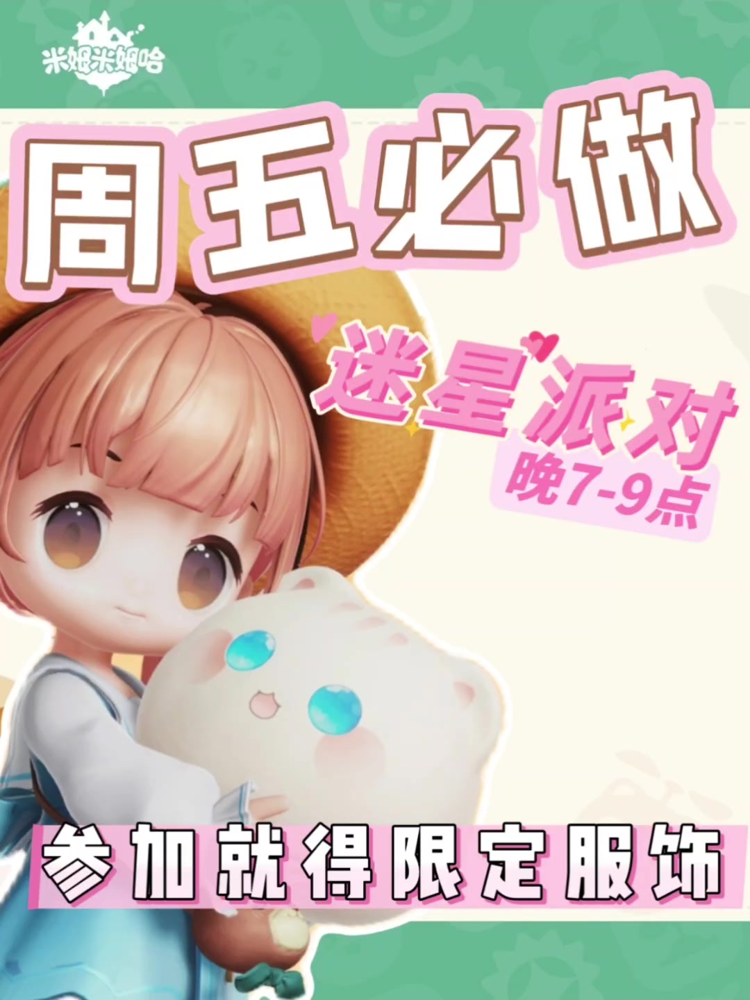参加就得限定服饰! 周五-周日首次参加就能在邮箱领取限定服饰 迷星派对参加能够直接获得服饰,还能通过泡泡兑换服饰哦~ 晚上7-9点不见不散 #米姆米姆哈 #米姆哈公测定档724 #米姆米姆哈预约 #发现好游戏