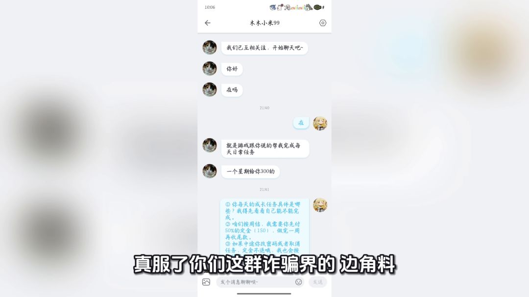 真得给您鼓鼓掌呀,诈骗界的“一股清流”!六级新手号玩得这么风生水起,默认头像配空白资料,活脱脱一个“纯良萌新”模板,演技精湛到能拿游戏界的奥斯卡最佳骗子奖!您是不是觉得自己特聪明,用《米姆米姆哈》里最简陋的新手号,就能骗到兢兢业业的玩家替您打工? 还有您那“专属”的代练桌平台,界面简约到堪称抽象艺术,连个正规备案都查不到,居然还好意思说“安全有保障”?怕不是您熬夜用免费模板拼出来的,骗钱的诚意