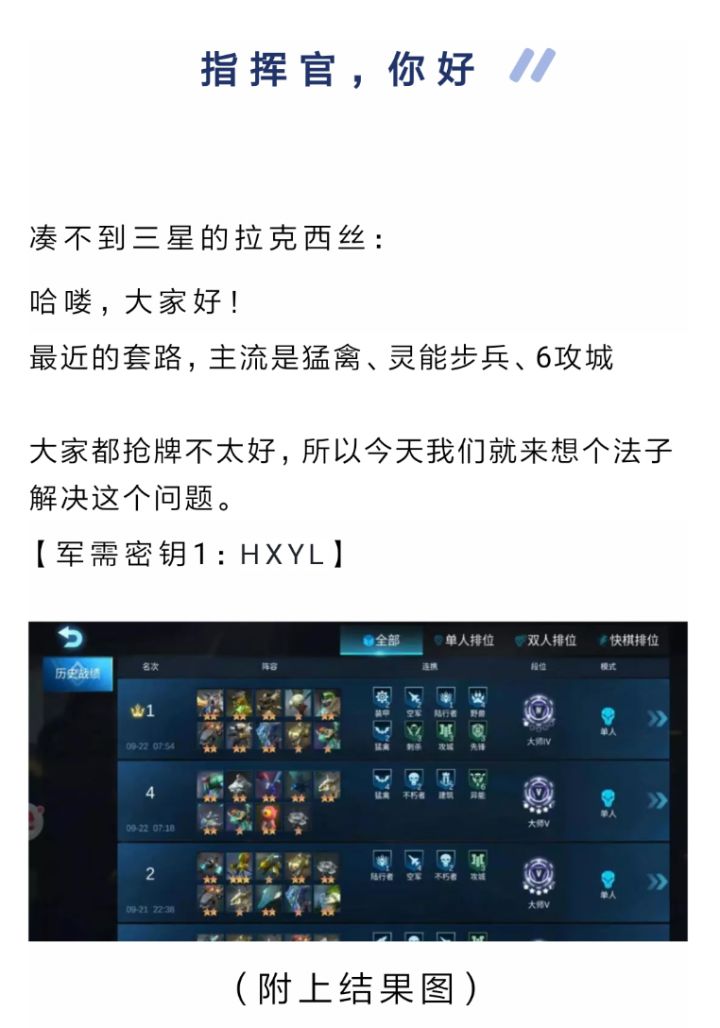 步兵狙击流 说实话就是靠质量一般来说 一局最多有两家玩就足够了否则必崩因为步兵前期还行 后期不是很强 后期如果没有质量完全是被虐的存在至少得两三个三星现在只要攻城 异能等阵容成型步兵完全不行