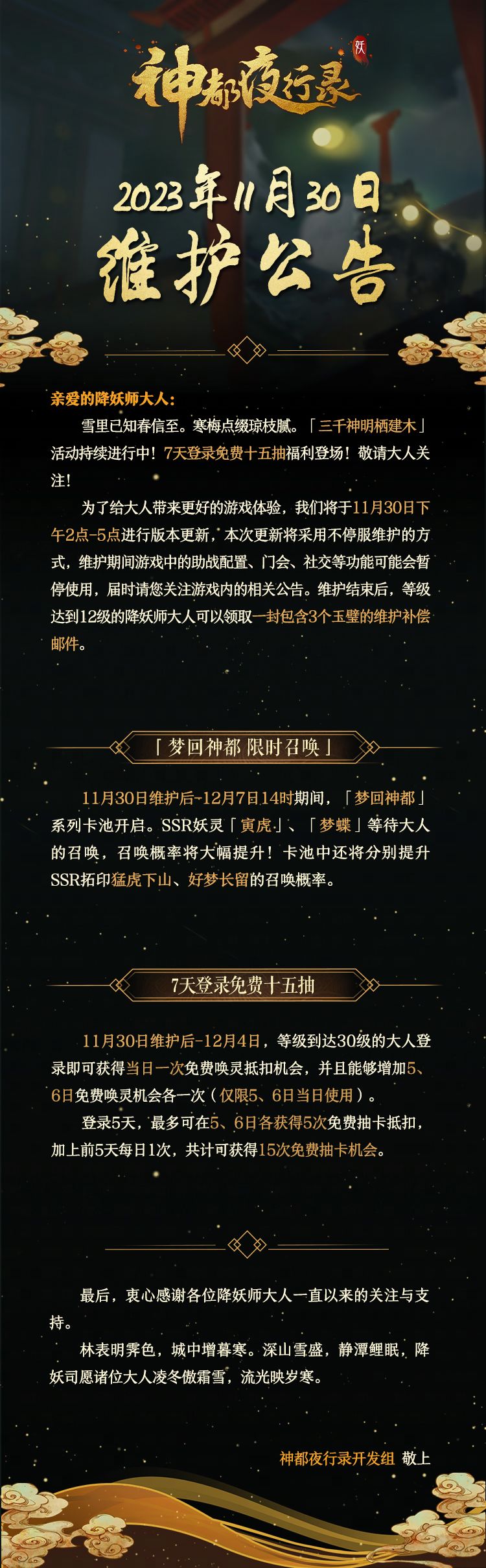 亲爱的降妖师大人: 雪里已知春信至,寒梅点缀琼枝腻。「三千神明栖建木」活动持续进行中!7天登录免费十五抽福利登场,敬请大人关注! 为了给大人带来更好的游戏体验,我们将于11月30日下午2点-5点进行版本更新,本次更新将采用不停服维护的方式,维护期间游戏中的助战配置、门会、社交等功能可能会暂停使用,届时请您关注游戏内的相关公告。维护结束后,等级达到12级的降妖师大人可以领取一封包含3个玉璧的维护补偿