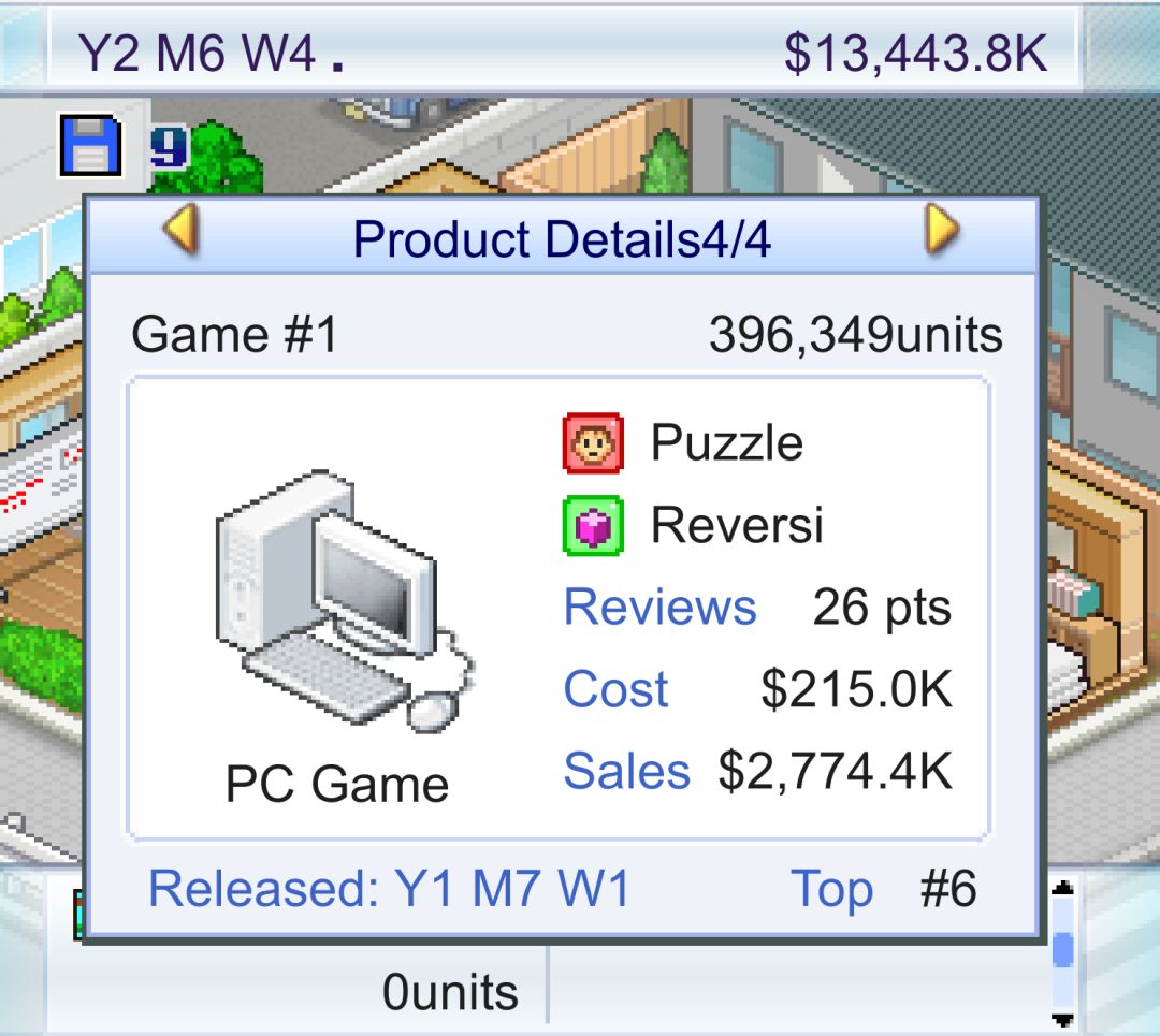 第一次玩这个游戏应该是好多年前,在安卓手机上玩的免费版 看到tap推荐,又在IOS商店买了个正版,系统升级了一些功能,尝试挑战下极限 游戏在第四年搬到6人办公室后才会有评奖,所以第四届游戏发展节是能够参加的第一届。 目标是在第四年12月的第三周前,拿到游戏发展节的“最优秀奖”,也就是金奖。 40分的满分顺便达成,金奖第一周被电视推荐+打月面广告,就有千万销量,年底就搬家8人办公室。 所以一切的前提