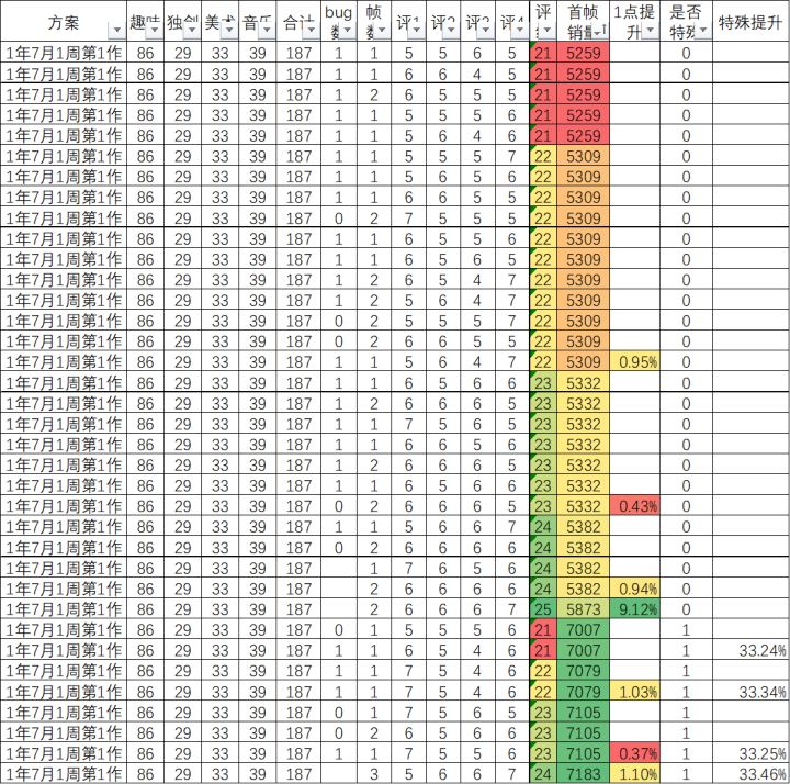 详细对比为了验证具体原因,细化了一些对比项,不过仍然没有发现可操作对比结果,只能看首周销量了,具体结论如下发布影响隐藏变量:发布后大概 22% 比例会出现一个随机 33%+ 差异的隐藏因素杂志评级影响:21 22 23 24 差距 1% 不到,25 比 24 提升了 10%,这个影响较大如下图看看出,无论 6 月 3 发布还是 7 月 1 发布,都会出现首帧相差30%+ 的情况,并且都出现