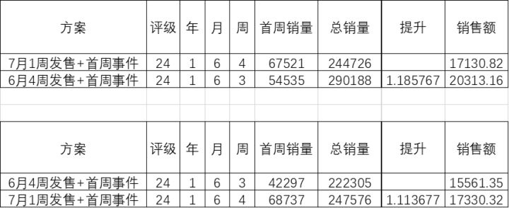 后面全部都是3次企划每次都 30 点左右,最终杂志评点 24点,发布后,发售前打 300*3次或4次广告,发售第一周出超人气杂志的销售情况对比如下是两个图是没有用外包(看制作费),7.1周发售销售额高如下是全外包,6月4周发售销售额高,7月1周发售和不外包差不多销售额另外之前有一次7月1周发布也到过2w,但是有些久了,忘了具体达成情况了下面情况和我现在测试不太一样,目前测试发售后广告没有收