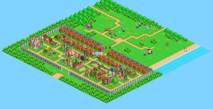 再来说说村落布局:沿着中路,从上到下开路,把旅馆放在最上面的左侧或者右侧,这样可以让冒险者快速回血。旁边建上武器店、防具店、饰品店,会摆景物的可以适当摆一些景物增加使用费。旅馆对面放餐馆、剑术道场,会摆景物的可以适当摆一些增加使用费。再下面一些放冒险者的居住屋。