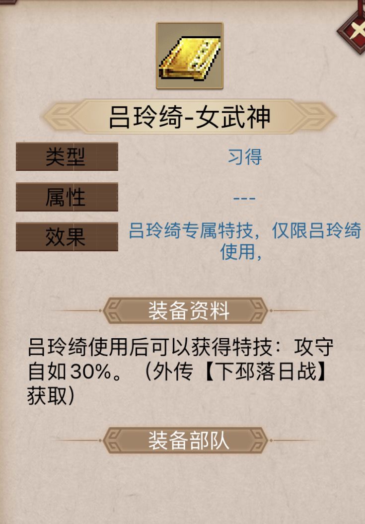 前言:本次挑战关卡奖励是跟号的,所以,大家可以集中资源吕布,吕玲绮,张辽,貂蝉,打完以后读以前档直接领取奖励就可以。 我下方攻略是第一次打这个外传,一边打一边记录,并没有集中给他们4个吃资源,都是最常规资源配备,所以对大众应该有一些参考性,主要是注意事项。 挑战难度通关奖励:吕玲绮专属特技书——女武神(攻守30%效果) 必出战人物 1. 吕布 2. 貂蝉 3. 吕玲绮 4. 张辽 配置: 吕
