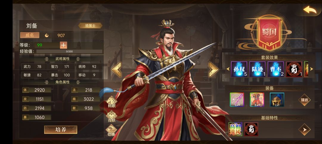这一关是蜀无双里最难的一关了,这一关妥妥的一将无能累死全军,刘备作得一手好死,所有的资源倾向于刘备也不嫌多,不然可能要重打好几回 一般刘备的出装是庞刀嘤嘤甲三生石2庞德魂2于禁魂,攻击书一套是必然的,爆伤书最好也给上,刘备在城里地形一般般,最好吃个120左右的地形,如果皮肤比较少(500-800,越高越好,提高容错率)拿最好穿彩嘤嘤甲,我是一个回忆录把关羽身上的书洗下来了,还有个没羽箭范围。 二般
