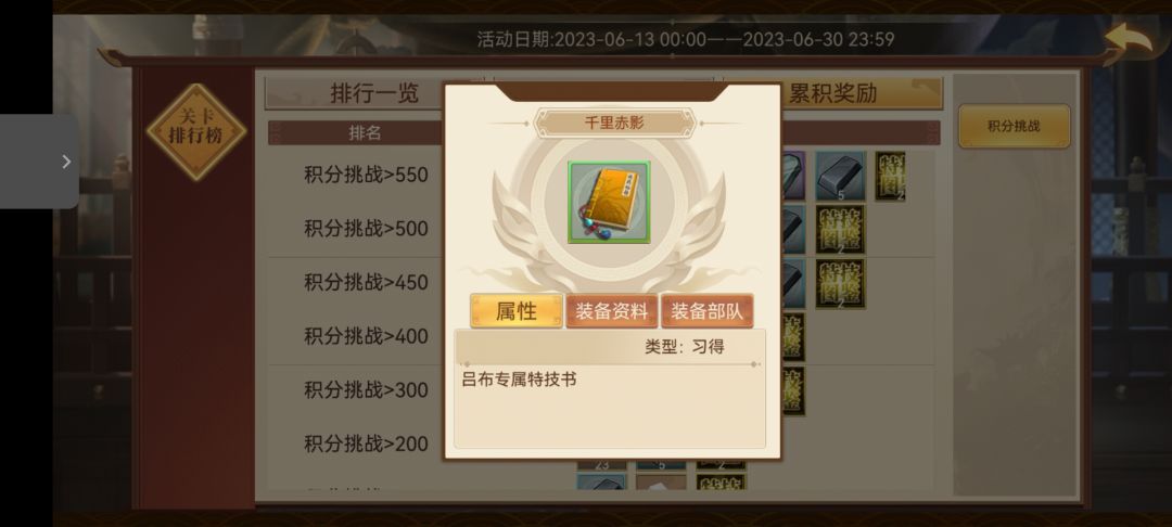 一、前言 大家好呀,好久没给大家攻略了,大家想我了嘛~别急别急,就在今天,更新了新的限时活动关—沙盘演武,听说超级有趣,是让大脑愉悦到颤抖的程度~本期就先为大家带来前瞻体验测评,之后我会给大家带来完整通关攻略。 二、关卡奖励 让我们来康康都有什么好东西~ wa!只要通关排名靠前,或者积分超过550,就可以获得吕布专属皮肤—穿越移动、全队100属性皮肤、特技书等等豪华奖励~ 大家心动吗,心动就快点来