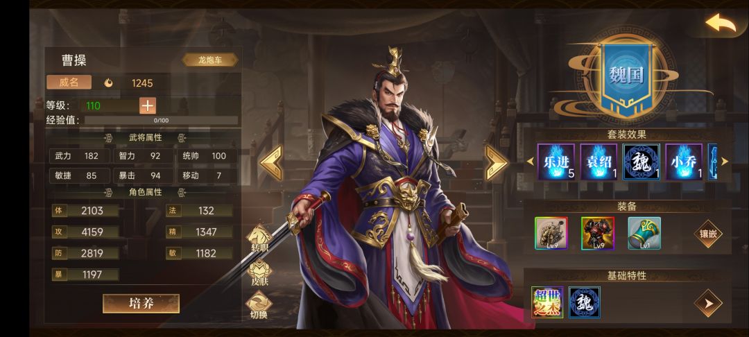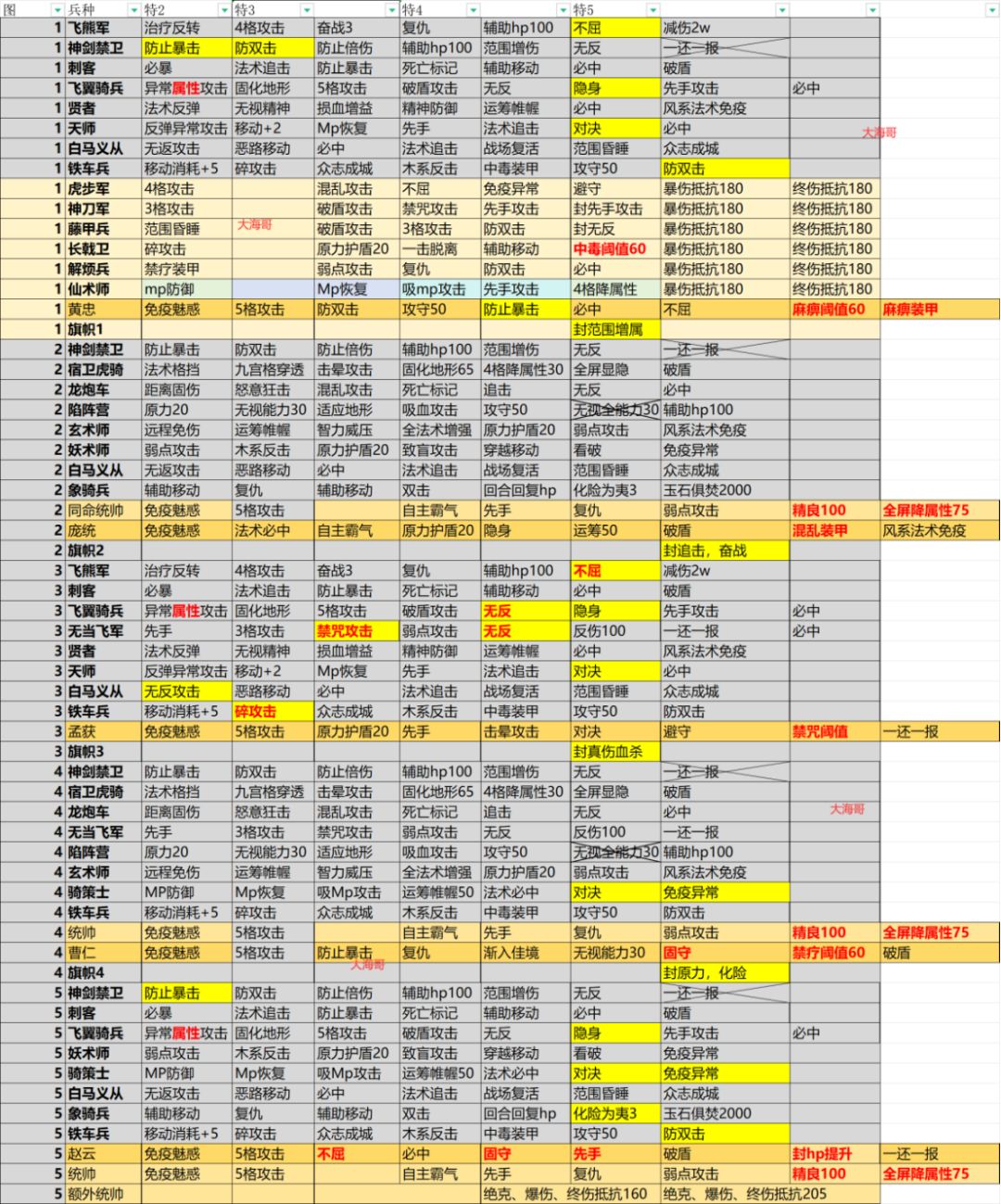 漆黑一团。 配置:象骑兵典韦(霸刀、锁甲、征战天下、魏无双20特技-必暴);郭嘉专属(阳炎扇、赤地千里、壮志雄心);太公天师肉,乐进枪无伤肉;郭嘉套骑策(司马懿可以用粮车);至少一个不屈(幸运玉坠);豹骑兵太史慈套(和郭嘉适配性不强,但是至少要有一个);宵天火炮+5周年(注意不要让张辽拿,会被穿透3覆盖),低配的落日弓+9也可以,其他装备(三尖刀、孟德新书) (11号位曹仁套没有派上用场,可以不要