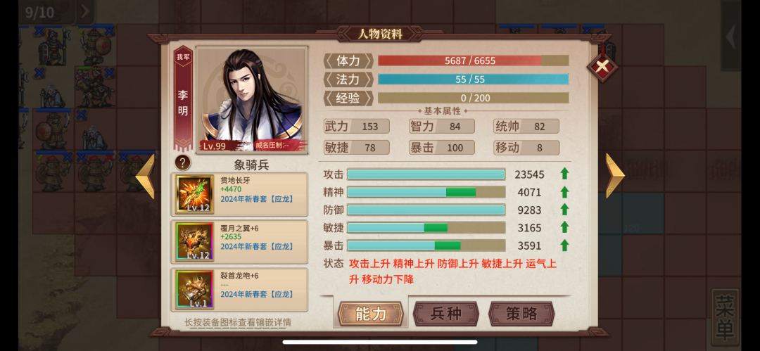 作者:一位神秘的终身大佬 姓名:不详 年龄:不详 职业:会计 平民化的李明,接地气的李明,萌新最爱的李明终于姗姗来迟。作为萌新初期的不二选择,李明谁用谁知道,用了都爱他。自带暴击威压,加点到暴击保证威压即可。竞争对手厚土还有198商城皮的五维威压,但李明胜在平民化,成型快。象骑兵在城区移动力很差,但为了这个移动力换专属又有点不舍得专属石。所以平民一般都是象骑李明。 象骑配霸刀,横行踩九宫。作为初期