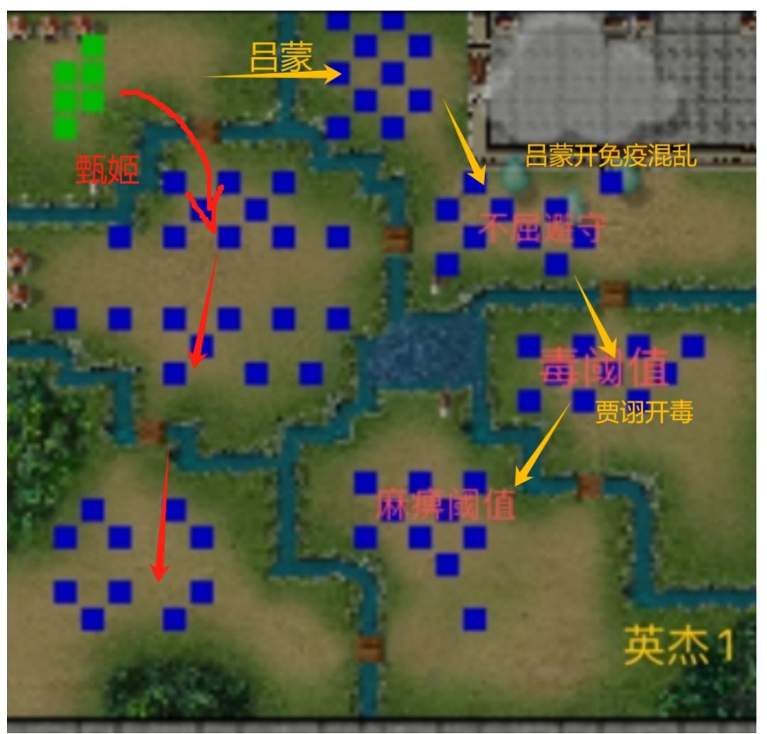 戏英杰-风云弈变积分赛 1. 敌军特技介绍 2. 任务 3. 配装(仅供双5、5+4难度参考) 4. 过关流程 图1:禁增属性 第一回合:开局兎剑跟比翼双飞分开站位,14人能吃到加速+霸气(五维buf) 诸葛果一动开全屏移动+2,二动到飞翼骑兵那给自己开破隐(这样主力过来就能杀隐身了) 孙权往图2入口走,全军强行留着图2开 马云禄无反先去杀门口不屈兵,打出不屈 郭嘉移动后开毒,触发祸