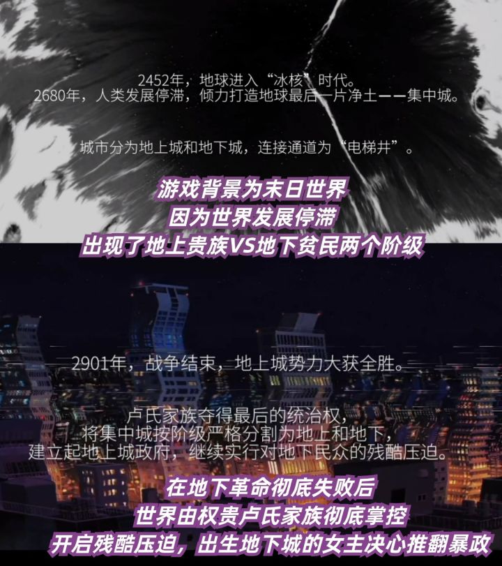 2386年,世界末日来领,地球正式进入“冰核时代”,人类寻找到最后的净土,建立了集中城。但随着政府被权贵架空,居住在地上的势力集团对下层大部分居民实行残酷的压迫与剥削。终于,下层居民不忍重负,奋起反抗,地上地下摩擦不断。在三年的反叛后,地上城大获全胜,卢氏集团在战争中获利最多,一举成为地上城的霸主。你扮演的女主出生于地下城,目睹了地下城的困苦,也遭受着地上城的压迫,你决心推翻地上城的统治,建