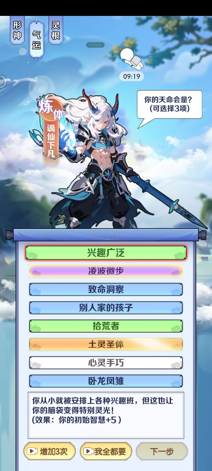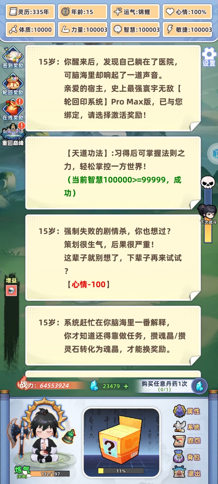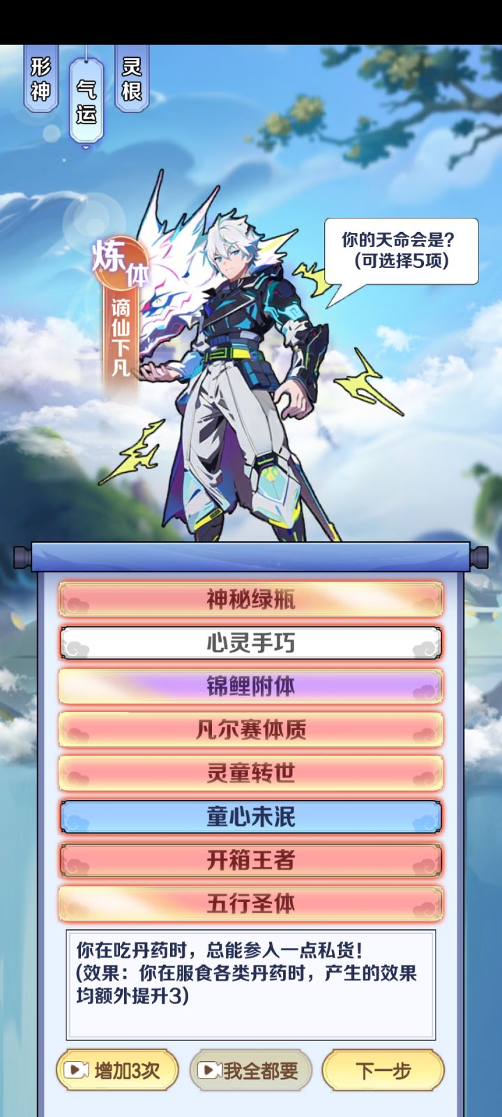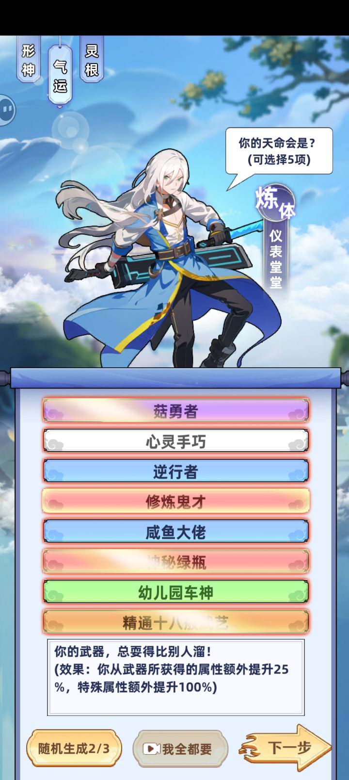 #游戏日常 #游戏攻略 #摆烂式修仙 开局选性格,无脑选暴击就好。颜值看个人,这个游戏魅力机制未补全,纯玩具属性。然后是气运,前期开局尽量选到加属性的,如灵童,魔丸,绿瓶等加属性的气运,用于化神前渡劫完美过度。最好有精通十八般武艺(装备特殊属性增加100%)橙色品质,红色强度。而且能吃性格属性。渡劫,筑基后无脑选第二项为完美渡劫,筑基前看着选。最后是选灵根,即属性(金木水火土)最高属性为主