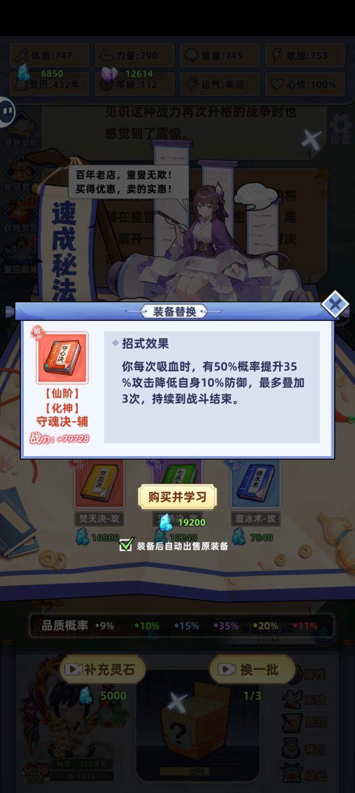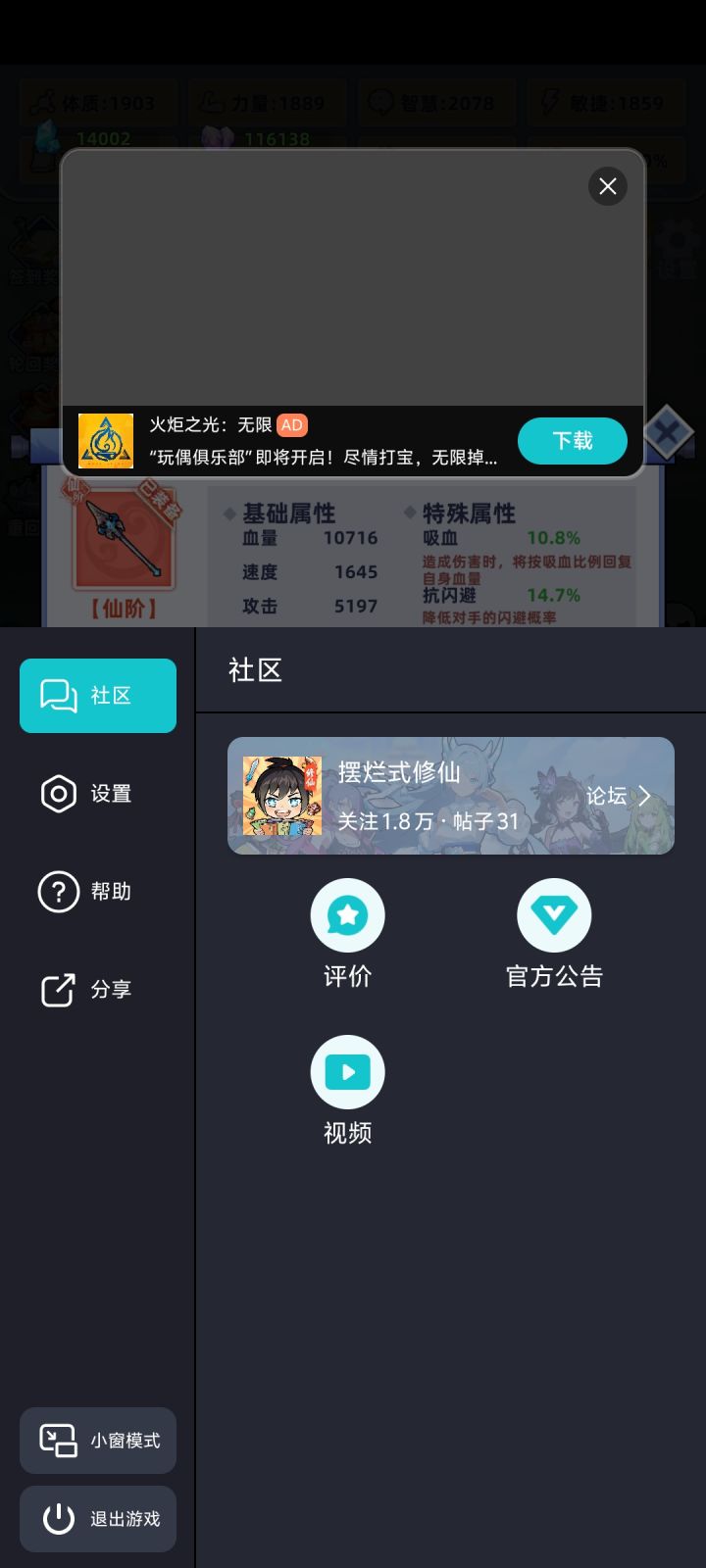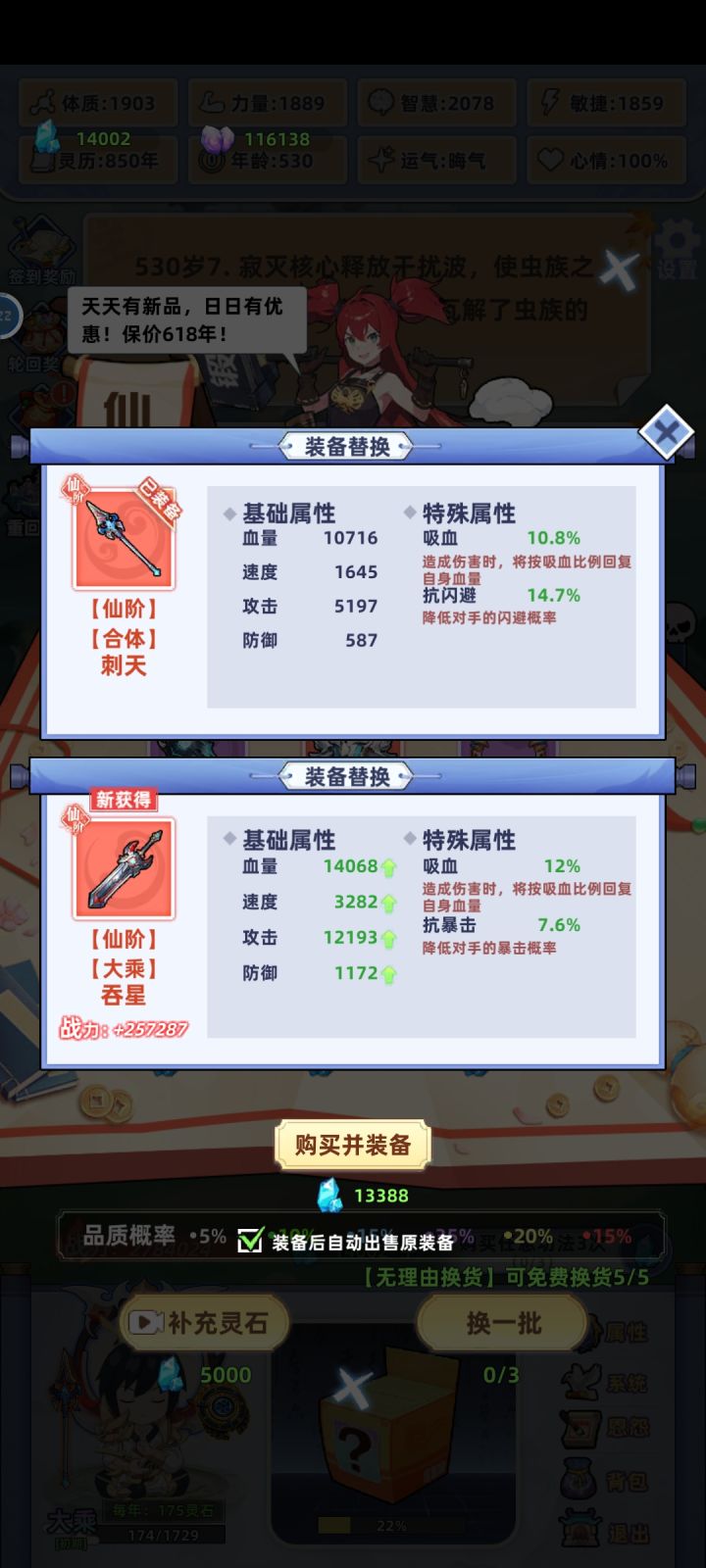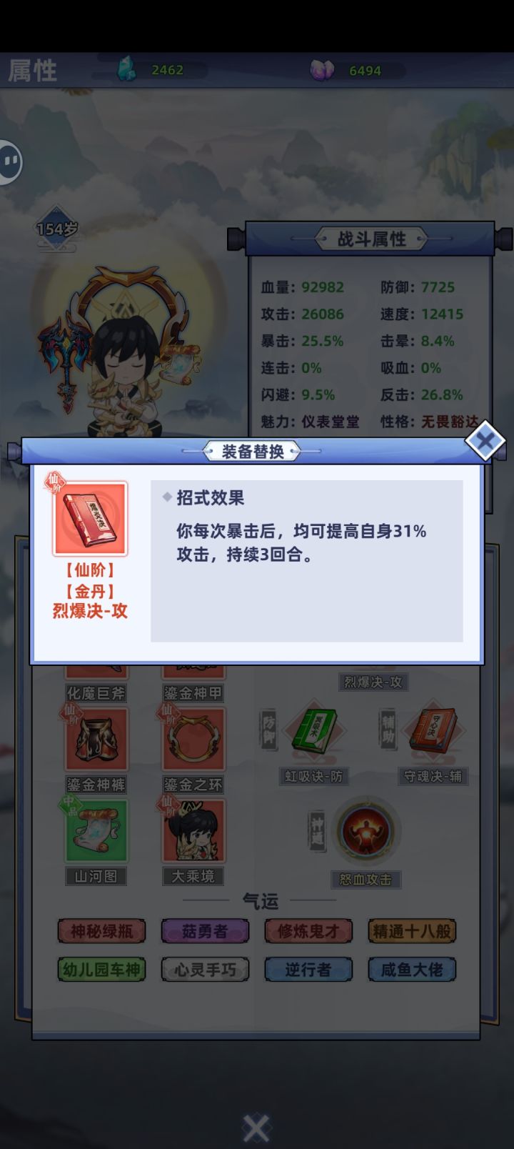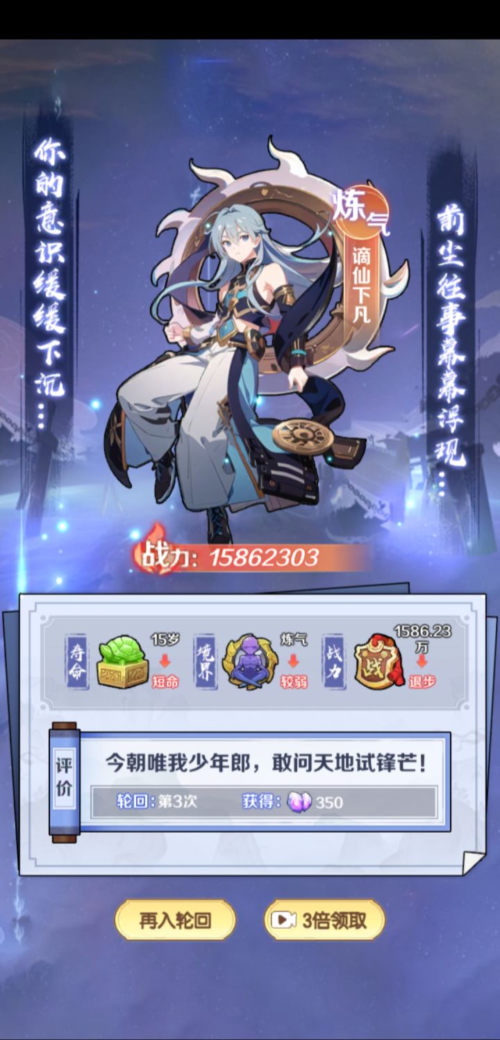 #游戏日常 #游戏攻略 #摆烂式修仙 开局选性格,无脑选暴击就好。颜值看个人,这个游戏魅力机制未补全,纯玩具属性。然后是气运,前期开局尽量选到加属性的,如灵童,魔丸,绿瓶等加属性的气运,用于化神前渡劫完美过度。最好有精通十八般武艺(装备特殊属性增加100%)橙色品质,红色强度。而且能吃性格属性。渡劫,筑基后无脑选第二项为完美渡劫,筑基前看着选。最后是选灵根,即属性(金木水火土)最高属性为主