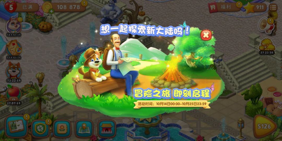大家晚上好!我是秃击队的幸福生活,我发现一个好玩的,梦幻花园出了一个大冒险活动,真的是太好玩了,你们有没有参加呀?会不会玩,我也是研究了一段时间才明白是怎么玩了的了,真的是大冒险呦!现在我给大家分享我的游戏心得吧。 【参与条件】 时间10月14日凌点到10月25号23:59 1、版本更新至3.2.0 2、关卡达到50关卡并且完成树屋第二天装饰,带着狗狗大冒险必须有养有狗狗。 打开游戏系统会指引咱们