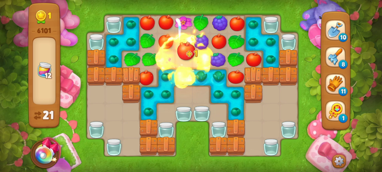 先把睡莲消除,然后把果酱罐灌满用道具清除,凑到双彩就在最后果酱罐装满了再清。