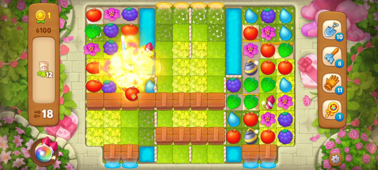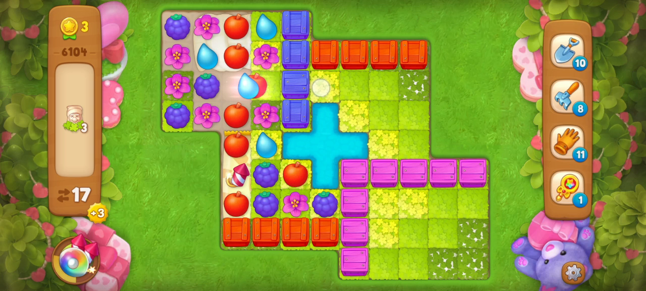 这一关先尽可能多得清箱子,主要是清左上角的反了L形两排箱子,然后再把叶子下面的密封烟花放出来,主要是左下角那个大的密封烟花,粉红色箱子下面只有一个小的。