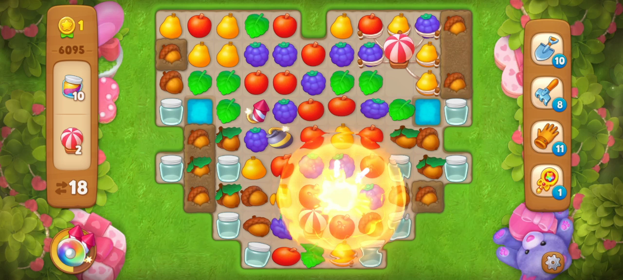 这一关开局左边合成一个炸弹,把上方的热气球放出来,然后多得道具凑双彩,不用管右边的气球把果酱罐装满后,直接双彩就可以集齐所有目标物。