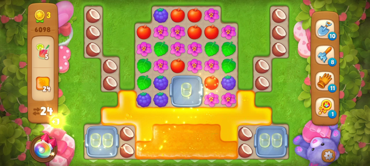先消除蜂蜜,然后用道具清椰子,在柠檬水托盘旁边消除让柠檬水能落下来,中间尽可能多的制造道具,凑到双彩容易过关,不然就是用彩虹球一次能在两个柠檬水托盘旁边消除元素。