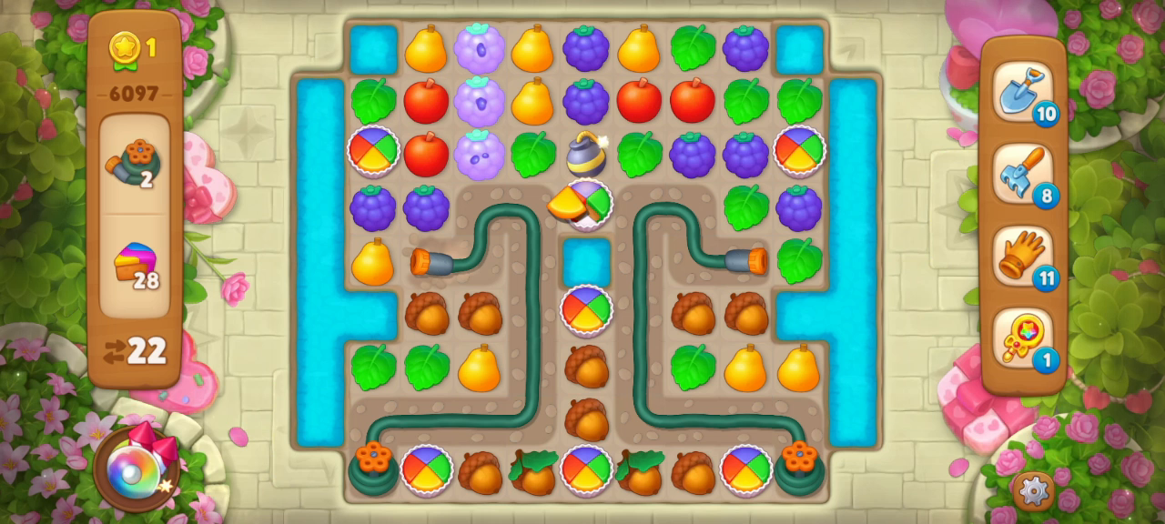 这一关开始先消除水管旁边蛋糕中的元素,让水管能同时后退,然后专注在水管旁边消除,直到谁还没有才开始在最后的三个蛋糕旁消除,最后多获得点道具都能过。