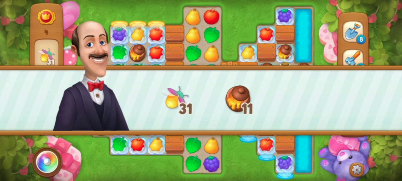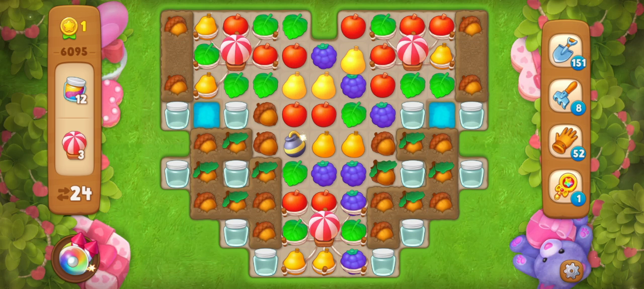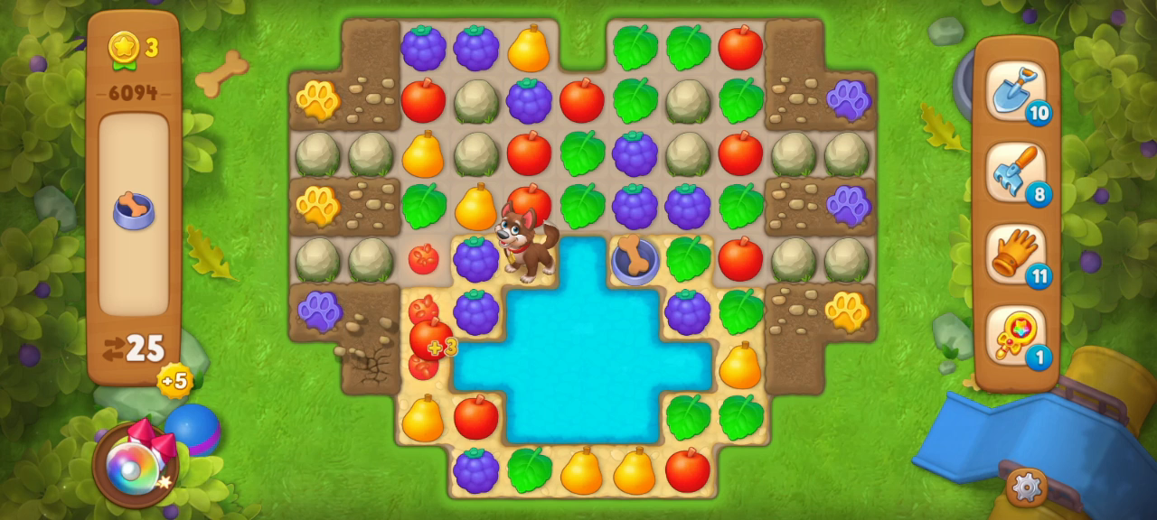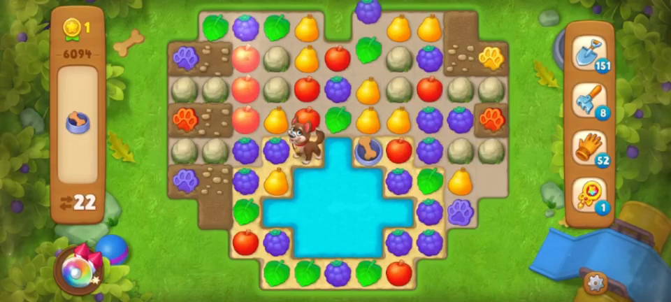这一关主要是制造道具消除石块和泥土,基本上土里埋的狗狗饼干剩一个的时候会从上方随机掉落饼干,尽可能用最少的步数先把旁边的饼干消除5个,后面就会轻松。