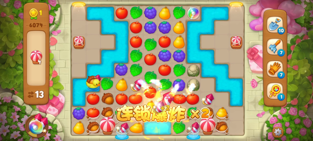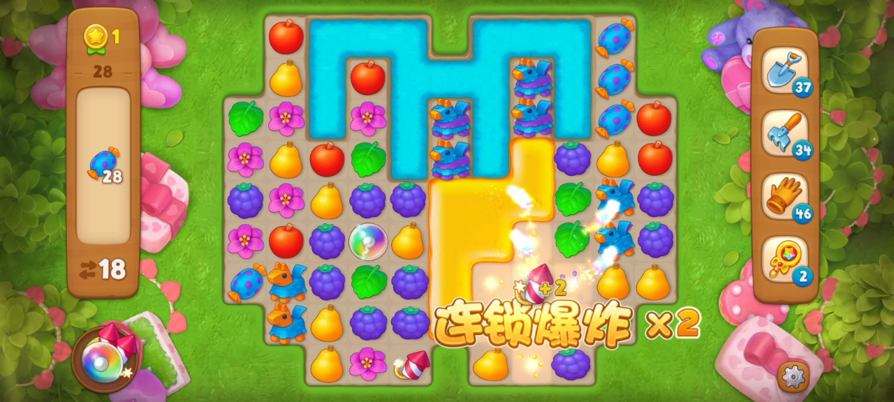 这一关主要是清除睡莲和箱子让元素掉落,然后是清除密封烟花上面的树叶,让烟花清除小矮人上面的树叶,集齐目标物。