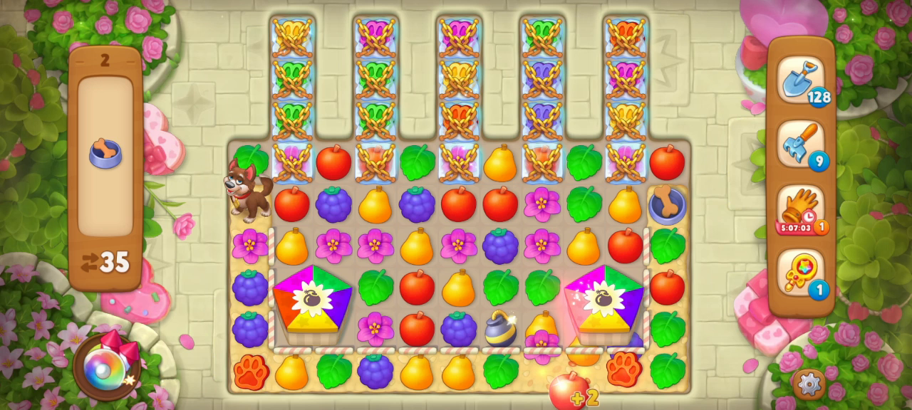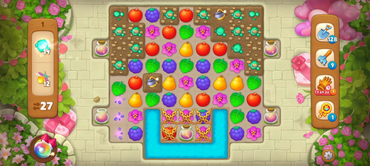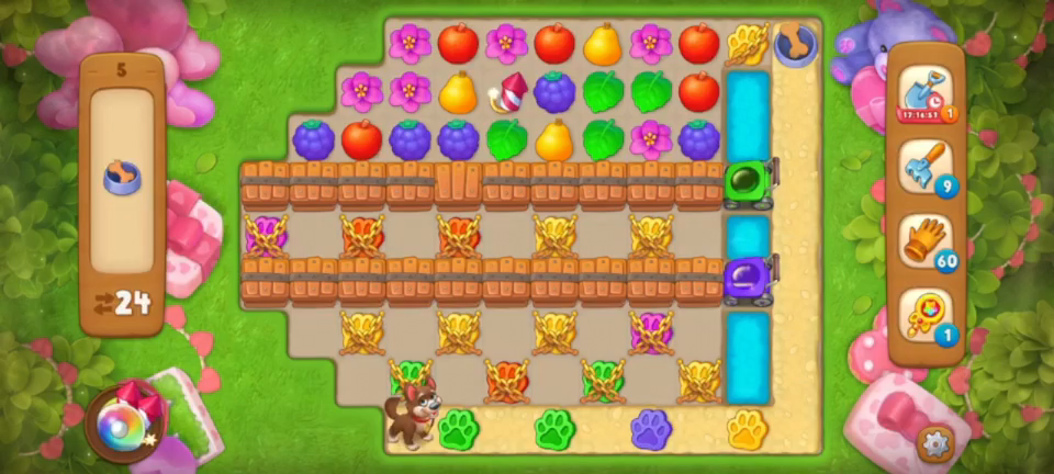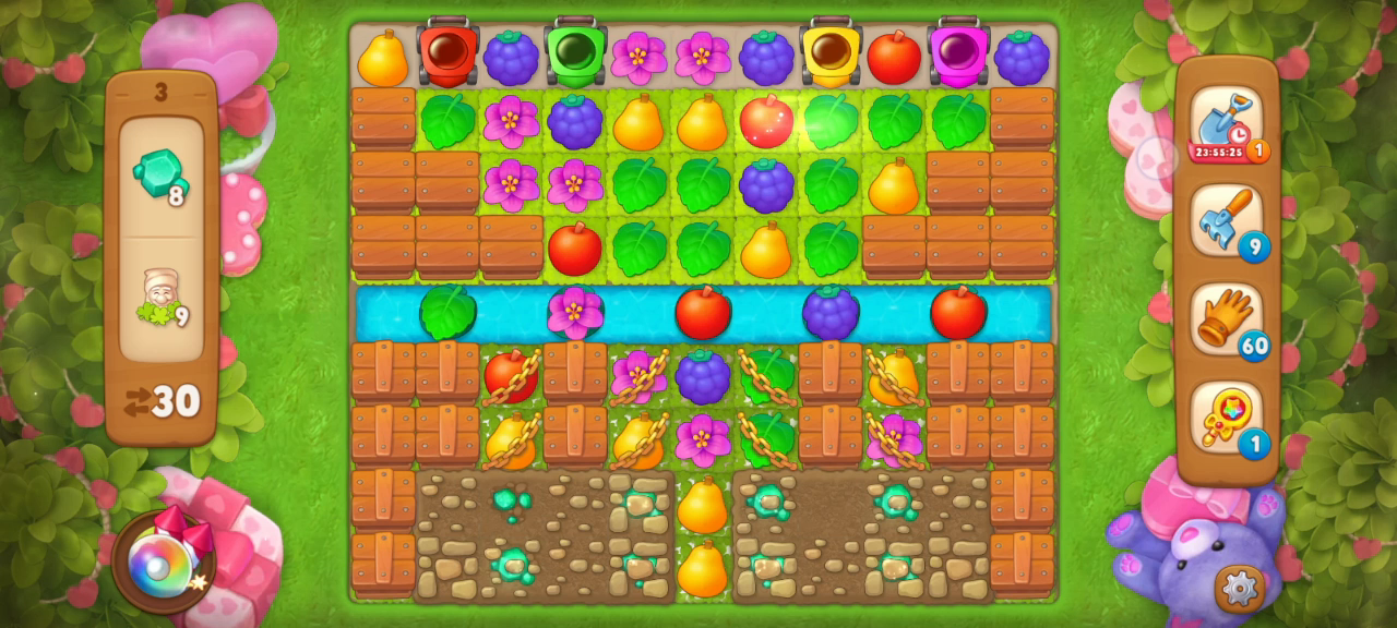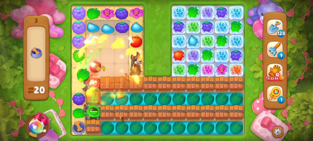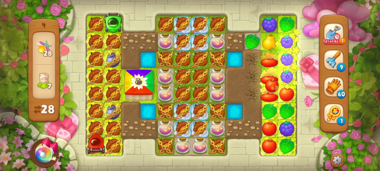 先在炸药箱旁清除和分区一样的元素,利用它集篮子里的元素清除野餐布,后面就简单了。