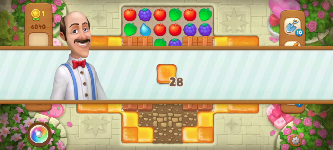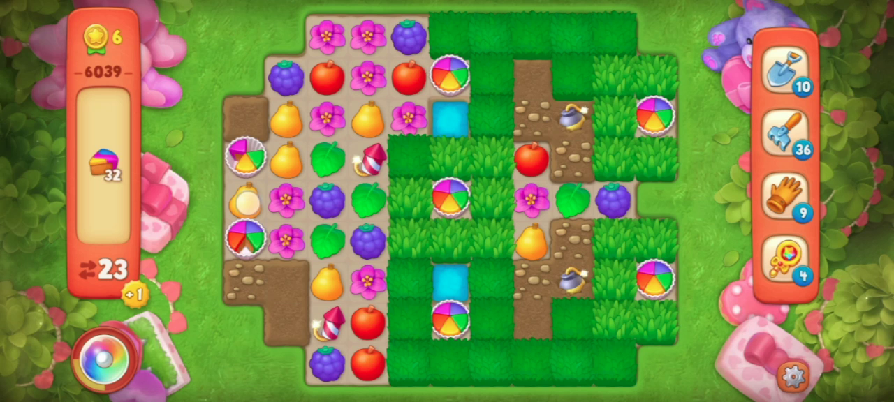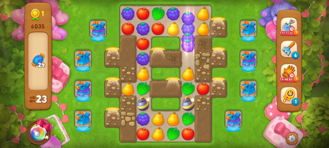 这一关主要是消掉土让皮纳塔落下来,在它旁边消除得到糖果,然后清除糖果就好了,中间得到彩虹弹先不要用,等皮纳塔清完一次性清除所有糖果!