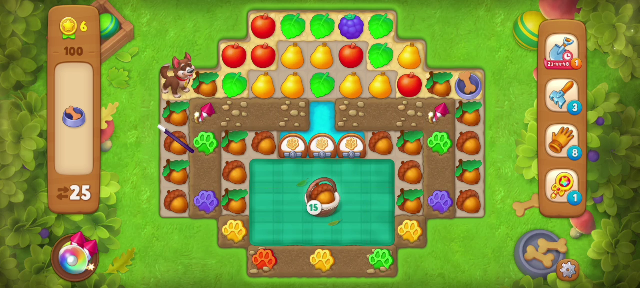 先在橡实旁边消除,或者用彩虹弹消除去清除野餐布,然后就是双彩让狗狗能多走几步