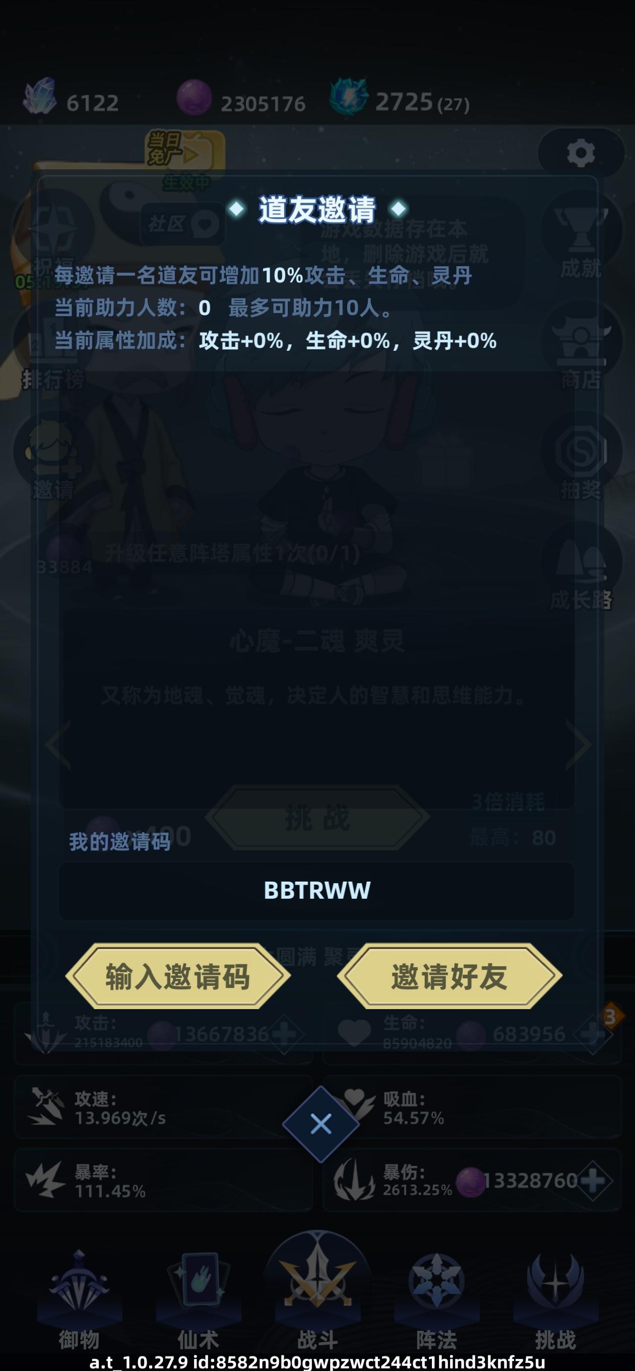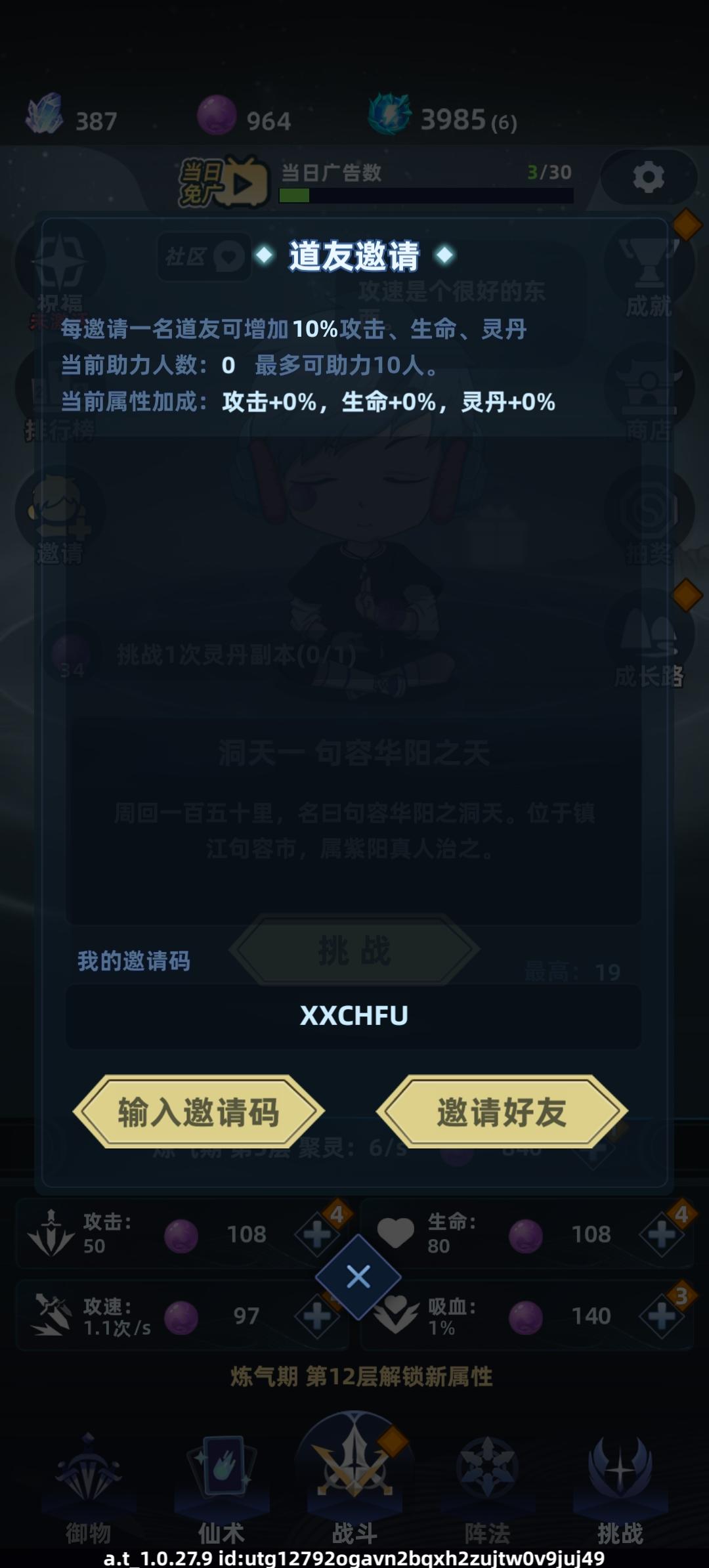 主界面,点开设置界面“兑换码”输入如下兑换码拿奖励 ARXUQQOB 灵石*20 灵丹*200 ZRHKQHZK 灵石*40 灵丹*500 AOIDJWLI 灵石*100 YLSTUDIO 灵石*100 灵丹*1000 OGMJMRBE 强化石*100 ISULXMYA 洗练石*20 QRWABAKK 宝锤*2 新手开局篇: 开局先升级境界,没什么好说的,增加资源获取的速度才是最