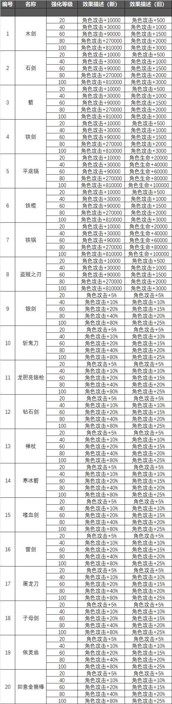 宝物强化和升星全局属性加成表