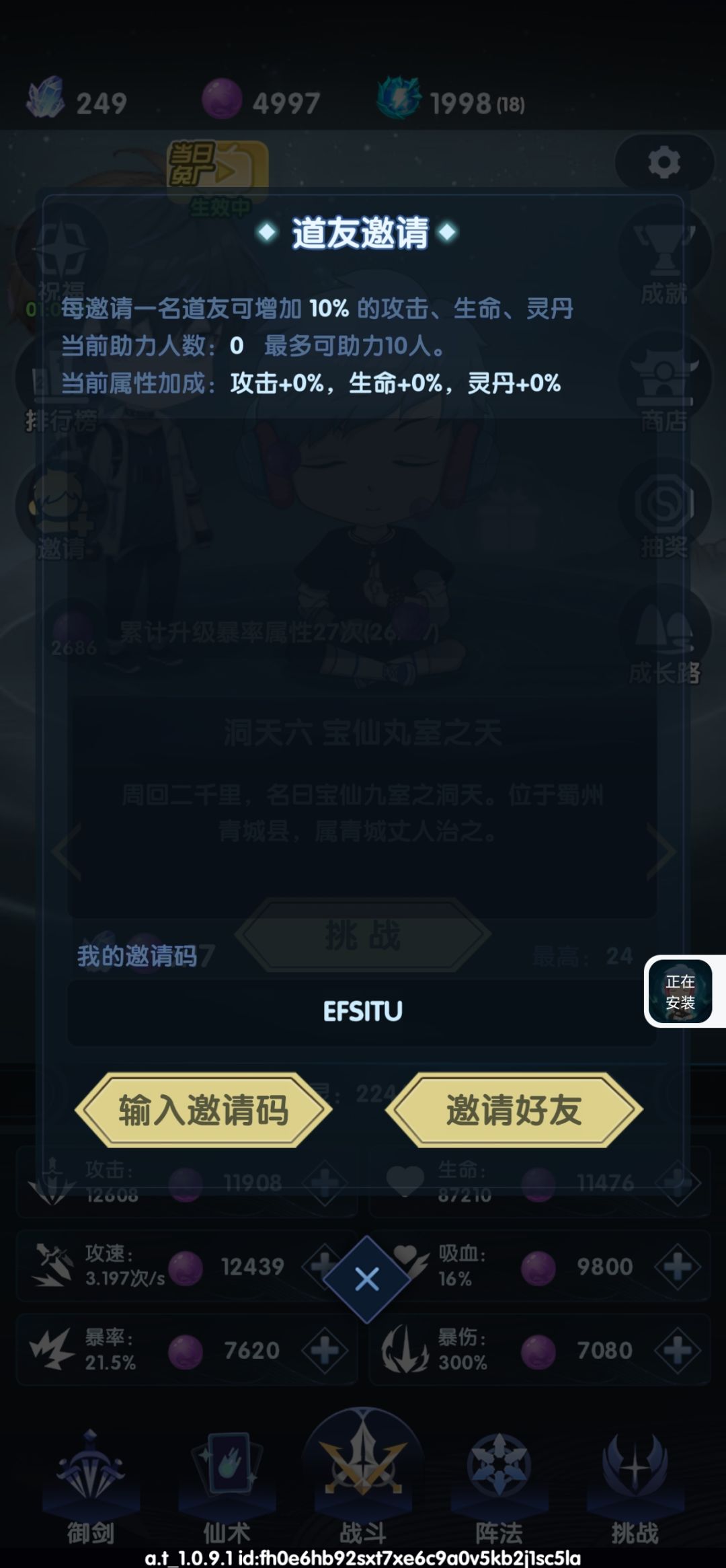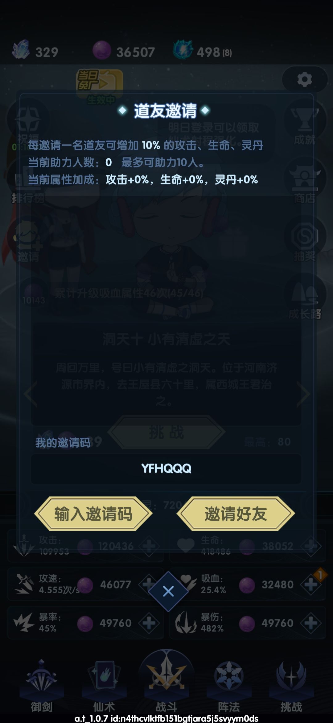 游戏主界面左侧邀请填写邀请码 UQVPAE 兑换码: ARXUQQOB 灵石*20 灵丹*200 ZRHKQHZK 灵石*40 灵丹*500 AOIDJWLI 灵石*100 YLSTUDIO 灵石*100 灵丹*1000 OGMJMRBE 强化石*100 ISULXMYA 洗练石*20 QRWABAKK 宝锤*2