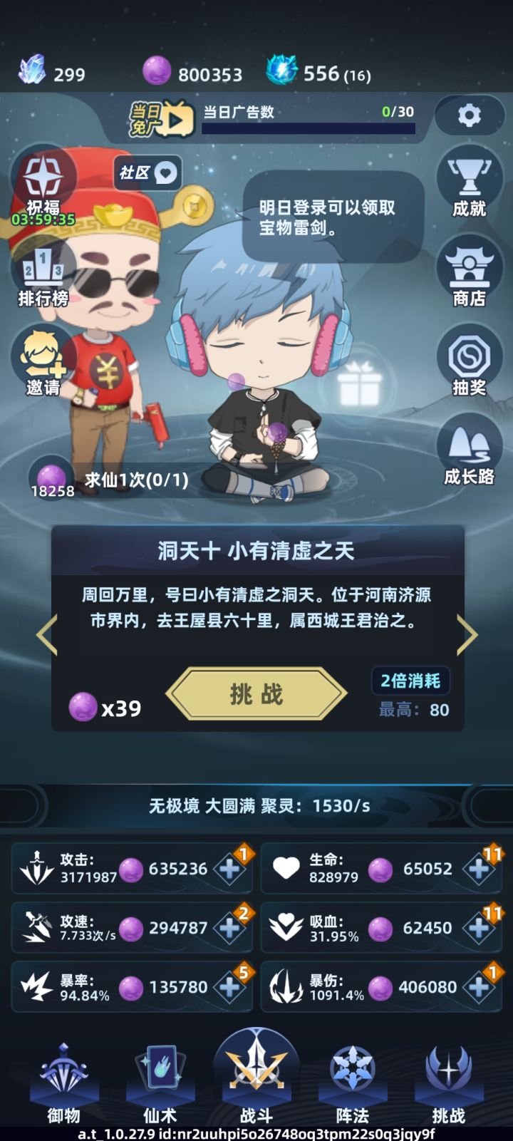 终于,从我12月5号到二十转至今终于过了,其实是能提前半个多月过的,不过想着通关之后就卸载游戏,所以多卡了时间来把这一转能升的都给拉满(包括阵眼的属性),以下是记录慢了别人好多才进榜道侣拉满的属性仙术拉满,这个最简单御器满星满级(友情提示,如果低转卡转生要过次元壁,星级和等级差不多就可以不买锤子和强化石,在拉人物属性的过程中的轮盘之类的也会掉,不会说跟仙术一样满了就去掉,道侣星级同理)阵