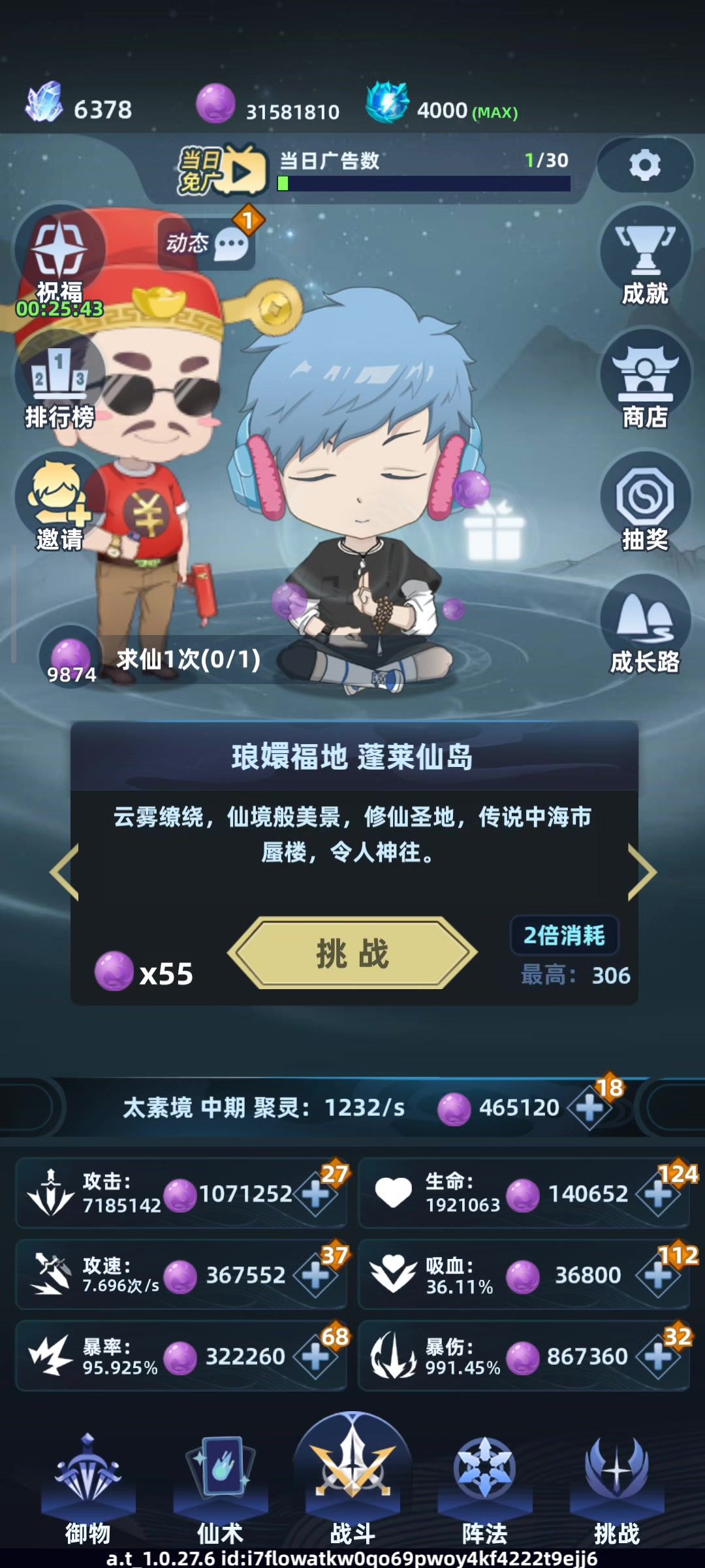 已经玩了13年了 还有几年就轮回了, 洞天450会卡一天 最好就是把所有武器升到20 绿色武器只升到20就行了 紫色橙色武器直接拉满 个人觉得先把仙术绿色拉满 再把道侣都升2星 其中财神、玄暗、张兰君升满或者4级 财神是加灵石的 玄暗是加花的 张兰君是加灵丹的 道侣属性的话 把攻速拉满 主角攻速点满 爆伤和攻击点到2000万灵丹就差不多了 其他点道侣 等我过了重启 再来详细说说见解 #依灵修仙 #