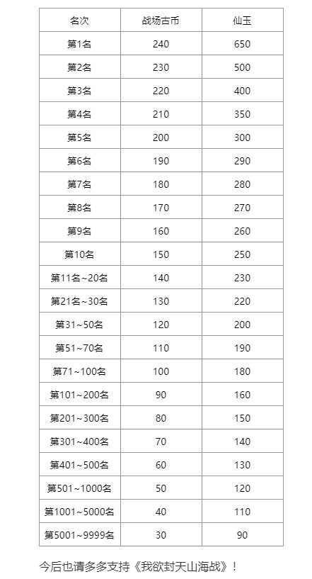 《我欲封天山海战》争霸奖励调整亲爱的仙友:《我欲封天山海战》开服已有大半年,为了感谢仙友们的支持,策划组决定调整争霸的福利,以便获得更多的物资去突破修为。[改动生效时间为8月20日]争霸排名奖励改动后的数量如下表格所示: