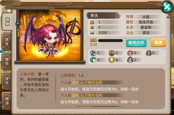 新英雄[ 帝天 ]的效果阵营:大能生肖:娄金狗功法:道法初始战斗力+3000人物介绍:第一序列,序列的最强者, 传说中真实身份为罗天在人界的分身。上阵限制: 1人个人技 战吼-以万物为刍狗战斗开始前,将敌方防御完全降为0,持续一回合个人技 战吼-以万物为刍狗战斗开始前,将敌方抗性完全降为0,持续一回合个人技 万灵朝贡当回合数大于5时,10%概率对敌方造成200%的普攻伤害,