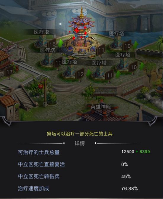 在《统治与文明》的游戏当中,经常出现联盟战争,特别被人进攻或者进攻其他人,期间士兵出现伤亡,如何救治你伤亡的士兵,使其恢复战斗力,这个就是接下来要介绍的一个建筑,这个建筑就是医院。开启:主城3级功能;救治伤亡的士兵与英雄作用:当出现伤亡的时候治疗士兵与英雄,使其恢复战斗力攻略:医院只有在战斗后才会显出他的重要性,但是也是一个非常重要的一个建筑,如果你的士兵在战斗后出现大批伤亡,您就需要医院