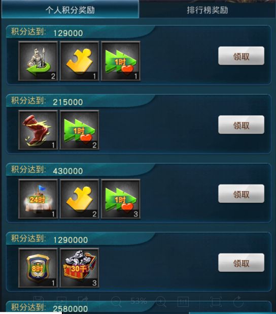 这个展示帝威活动在《统治与文明》游戏中的活动奖励算的上是非常丰厚,除了个人积分奖励之外,还有排名奖励,排名奖励除了丰厚的钻石之外,还有橙色名人碎片(白起)可以获得积分奖励总共是7个档次,积分最低要求是129000积分即可领取第一档次奖励,达到8600000分就可以领取所有档次的奖励。而排行榜奖励呢,总共分为6个档次,最低领取是10000名都可以领取到奖励,基本只要参与就可以获得奖励哦,最高的奖