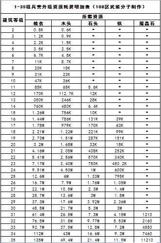 各位领主们晚上好,本次游戏攻略版块小编给大家找来了详细的1-35级兵营升级资源耗费一览表,领主大人们就不用四处去寻找啦,收藏本文章即可! PS:感谢领主“武装分子”的无私分享~ 以上内容由玩家分享,仅供参考!