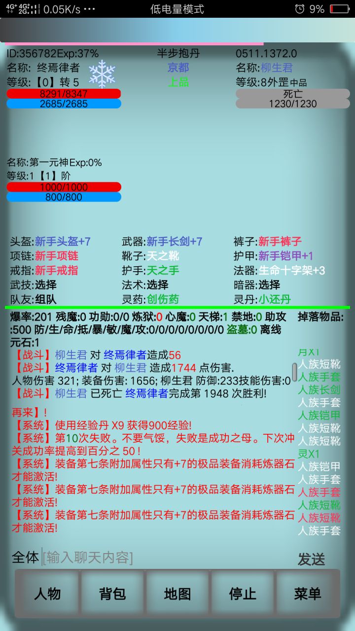 新手入门攻略 1.0 (作者:九竹书生)此文介绍新手入门到16级应该做的事情!!本文字数两千两百左右,阅读大概需要五分钟!游戏开局属性不用随机,不在乎哪点属性(附带属性说明:力量决定最低攻击,防御减少伤害,智力决定爆击,速度决定闪避),推荐人ID不用填,还有记得想一个威武霸气的名字!!不要用默认名字 因为默认的名字实在是太多了!然后创建角色!进游戏后点背包,穿上作者为你们装备的豪华新手套装