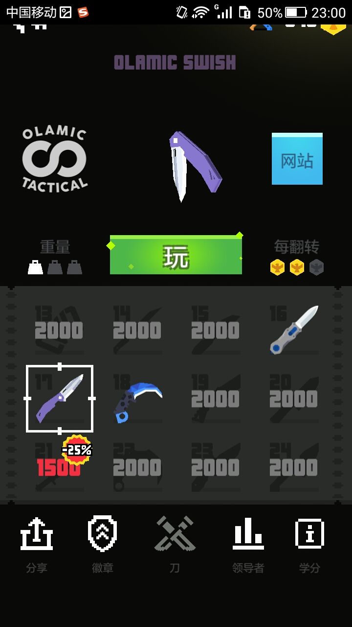 首先当然是我们的最贵的刀了,建议一开始可以攒钱买这把刀(看广告的刀也是相同),虽然这把刀在2合1中并不给力,不适合刷钱,但是在飞靶子上这把刀刷钱真的很快,基本不需要技术