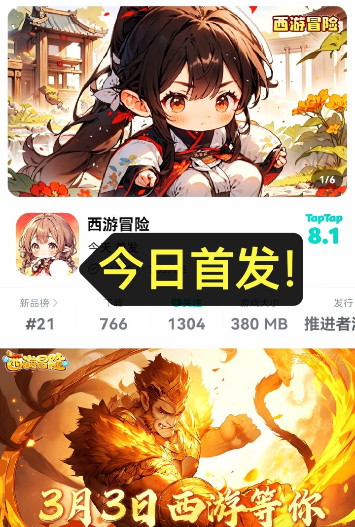 《西游冒险》于3月3日(今日)首发上线‼️这是一款高爆率的回合制角色扮演手游,游戏以即时战斗➕PK为核心,独享霸气装备、多种BOSS爆率超高~💠💠💠游戏大小:380MB官方活动:【福利】有奖分享丨https://www.taptap.cn/moment/513293635597370139目前位于新品榜#21⬇️感兴趣的小伙伴点击文章下方即可体验⬇️#游戏种草计划#新游安利#新游首发#角色扮演