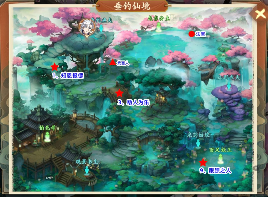 1.垂钓仙境,左上的荷叶上的女孩-西岐,降妖师 2.朝歌,中间台阶,跃跃-纣王后面-中间雕像-左下角罗宣-右上角啸风妖王 3.垂钓仙境,中间桥上老人-西岐,药材商人,买药送回垂钓仙境桥上 4.九幽冥界,神荼右边士兵鬼魂-西岐,酒楼买酒送回去 5.东海龙宫,敖丙上面龙宫鱼兵-西岐,装备商人买铁送回去 6.牧野战场,中间下面的村民-韦护旁边的盒子-黄飞虎 7.东海龙宫,右上角龙宫侍女-下面中间的桥上触