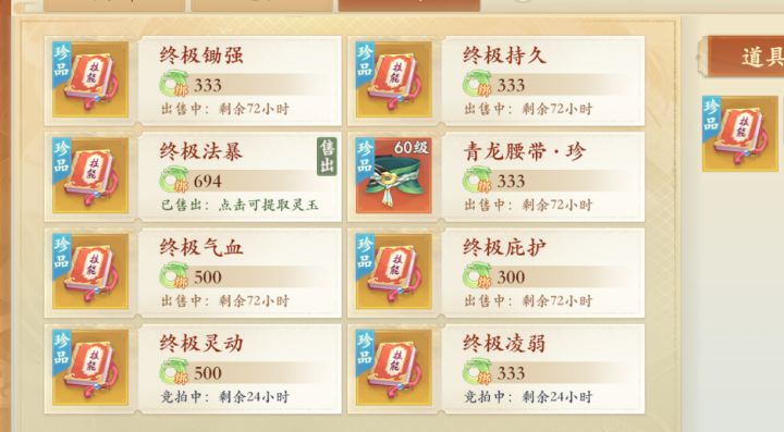 氪了1900,有神兽小狐狸,伪7爆猴子,5红技能全有用的法宝。还有2件3特效珍品60级装备,其中一件4700有人出价了。终极技能书10本, 我没空玩了,想着1折出售吧,我还害怕没人要,上架1分钟就有人购买了,