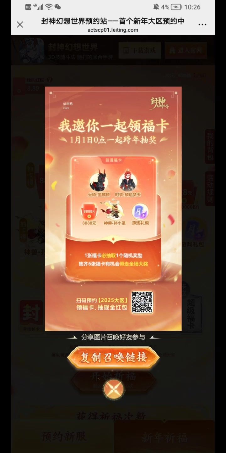 封神首个新年【2025大区】来啦,和我一起预约,有机会一次性带走神兽、新时装、新坐骑和8888元 https://actscp01.leiting.com/fs/act/202412/qili/?share_code=603678f66f261ffa56ae1884649f00ee
