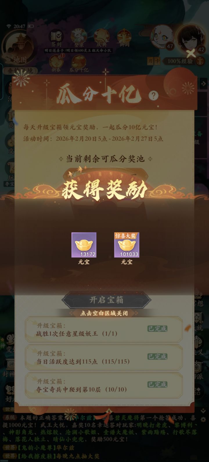 🎉大人们春节快乐!新的一年,蛙哥的祝福也第一时间送到!点开视频看看你定格的是哪一份新年好彩头? 🎁 今日开年福利 · 新年口令红包 🎁 在世界频道送出你的新春祝福【新年快乐马到成功】,即可直接领取蛙哥准备的18888元宝! 🗓️【活动时间】 2月17日00:00 - 2月18日00:00 🧨快上线喊出祝福领元宝吧~