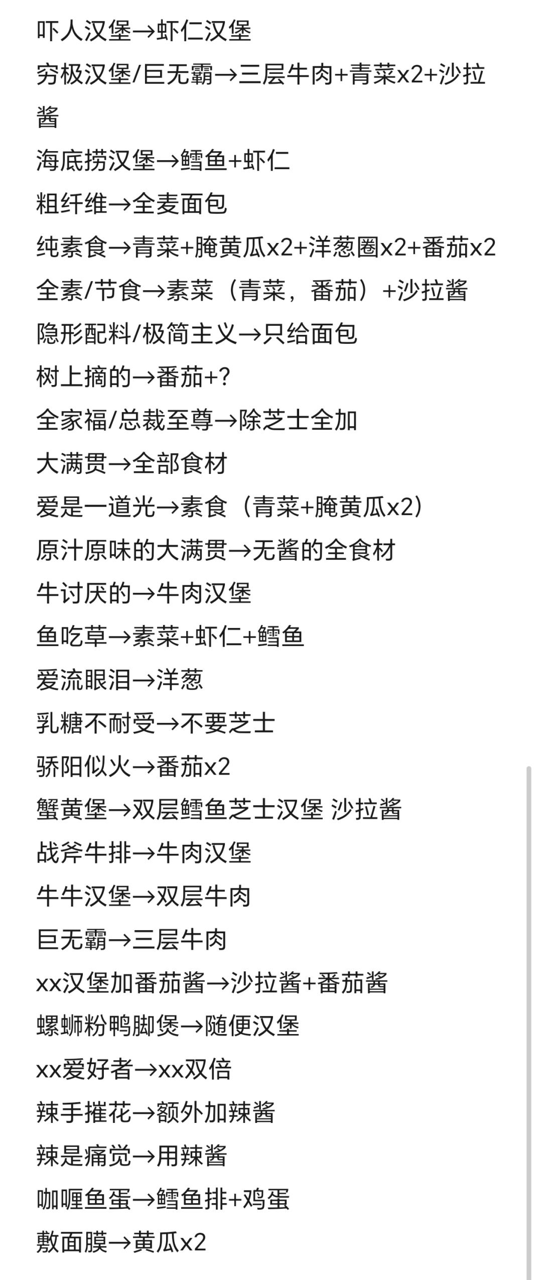 吓人汉堡→虾仁汉堡 穷极汉堡/巨无霸→三层牛肉+青菜x2+沙拉酱 海底捞汉堡→鳕鱼+虾仁 粗纤维→全麦面包 纯素食→青菜+腌黄瓜x2+洋葱圈x2+番茄x2 全素/节食→素菜(青菜,番茄)+沙拉酱 隐形配料/极简主义→只给面包 树上摘的→番茄+? 全家福/总裁至尊→除芝士全加 大满贯→全部食材 爱是一道光→素食(青菜+腌黄瓜x2) 原汁原味的大满贯→无酱的全食材 牛讨厌的→牛肉汉堡 鱼吃草→素菜+虾