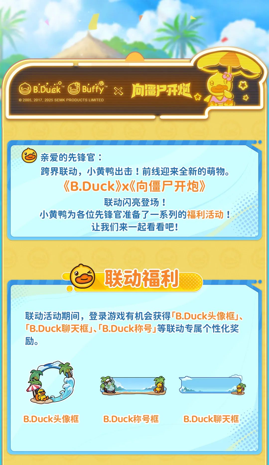 惊喜联动礼包1:BDUCK4566 惊喜联动礼包2:DK11223 惊喜联动礼包3:BDUCK123 惊喜联动礼包4:BDLD123 前线迎来全新的萌物 《B.Duck》x《向僵尸开炮》联动即将开启!