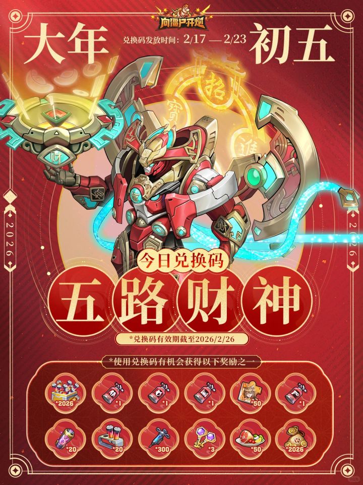 前往游戏兑换新春福利码,有机会获得新春佣兵·善财灵猫及红塑剂等游戏好礼,更有机会赢取焕新试剂*2026!【今日兑换码】五路财神【注意事项】①兑换时注意使用简体中文;②兑换截止时间至2026/02/26 23:59:59
