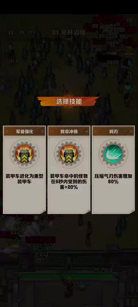 基础战力100,攻击力只有10,攻击力好像只和装备有关,像头盔,护臂,衣服,裤子,手套,足部,阶数越高、等级越高,攻击力越强。不过怪物血量是真离谱,20关,一个怪少说也有5000血,太离谱了。。。。