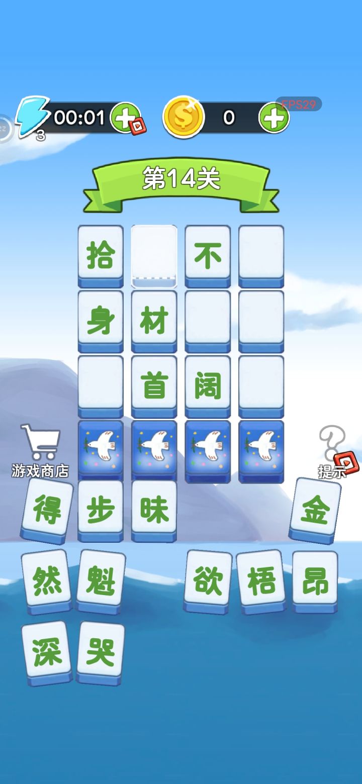 休闲游戏很简单,句子也不一定都是成语,大部分源自于生活很好猜。难度不大,适合小孩子玩,若目标是低龄儿童的话很合适,一边认字一边可以寓教于乐。关卡设计类似羊了个羊的层叠样式,层数随关卡数量而增加,难度体验很好。